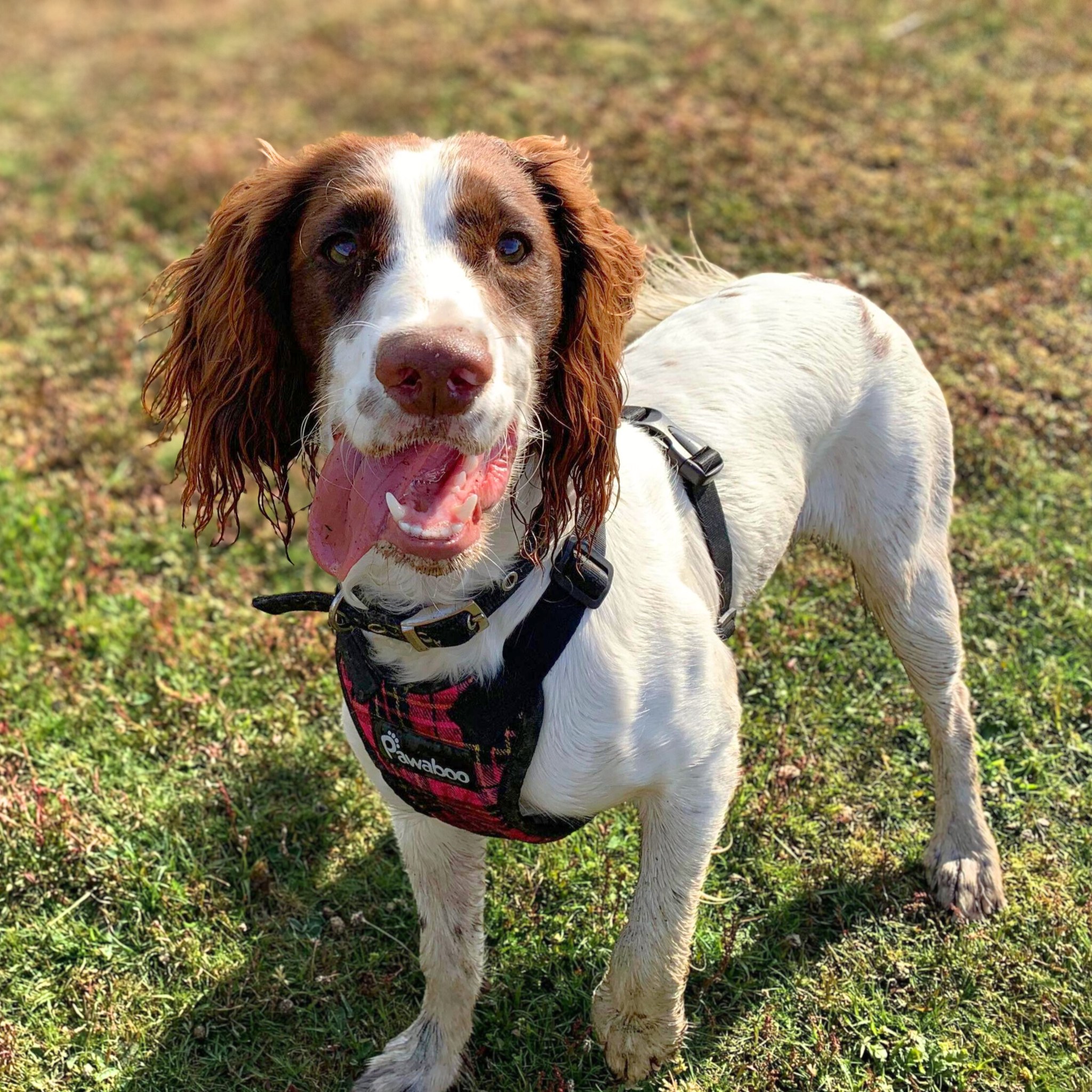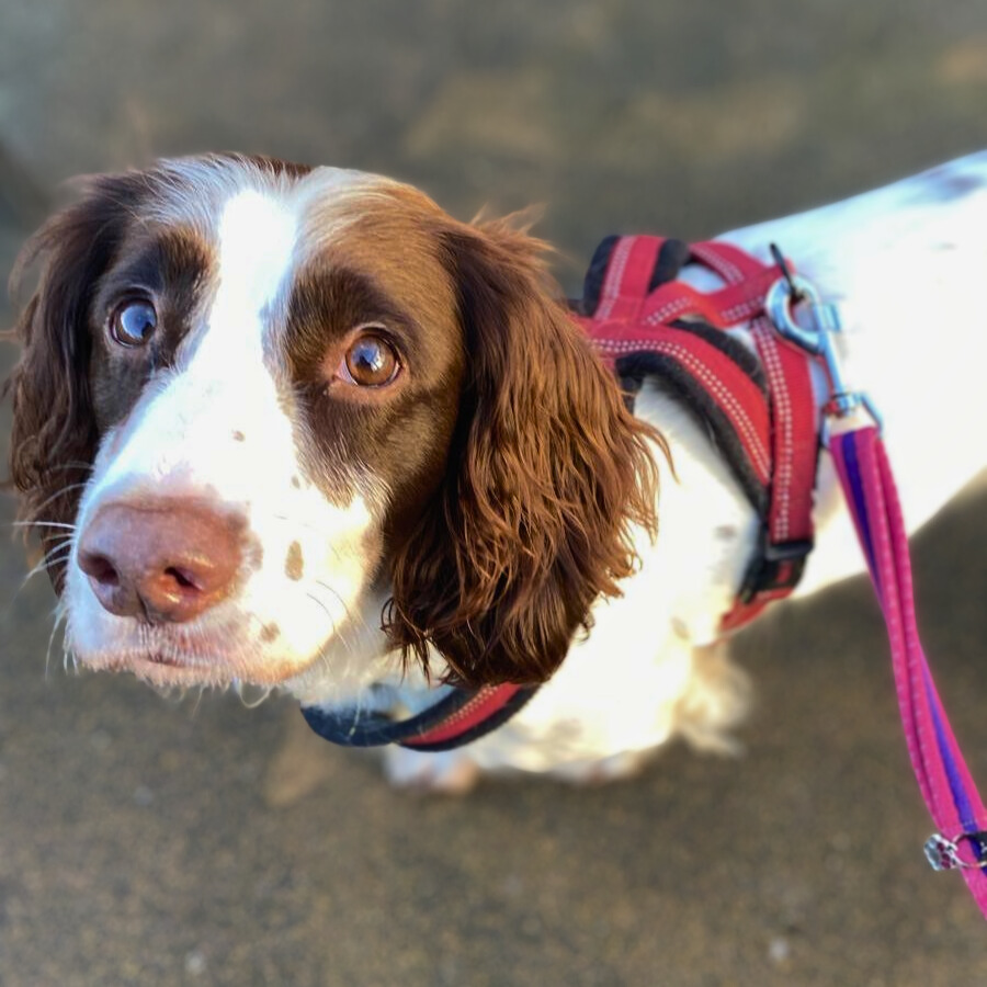 Poppy beherrscht die gängigen Grundkommandos auf Englisch. Weiter gearbeitet werden muss an ihrer Leinenführigkeit – sie wird derzeit mit Halti geführt.
