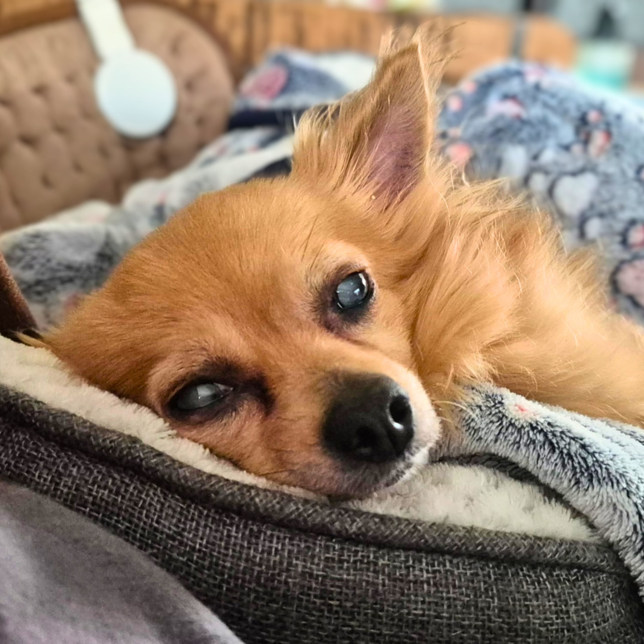 Trever leidet an grauem Star, eine genaue Abklärung erfolgt zeitnah bei einem spezialisierten Tierarzt. Zudem hat er Zwergrasse-typisch eine Patellaluxation, welche ihn im Alltag aktuell nicht einschränkt, sowie einen Mitralklappendefekt – dieser wurde bereits untersucht, aktuell sind keine Medikamente notwendig, es sollte aber eine regelmäßige Kontrolle erfolgen.